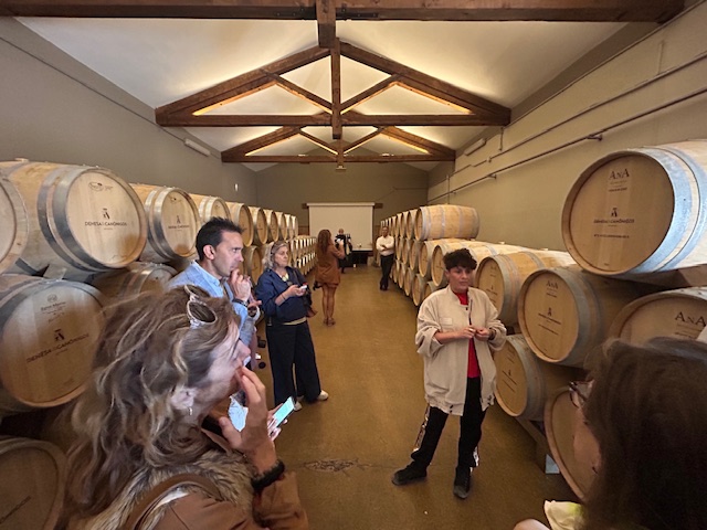 La última Bodega a visitar en estas dos jornadas aparece en una construcción que podríamos sacar de Euskadi. Dehesa de los Canónigos no tiene nada que ver con construcciones castellanas, es una memoria arquitectónica del país norteño. Un caserío vasco, que se conserva en la actualidad como vivienda familiar. Nos reciben Belén e Iván Sanz Cid, dos de los cuatro hijos de la familia, y quienes están ahora al frente de la bodega.